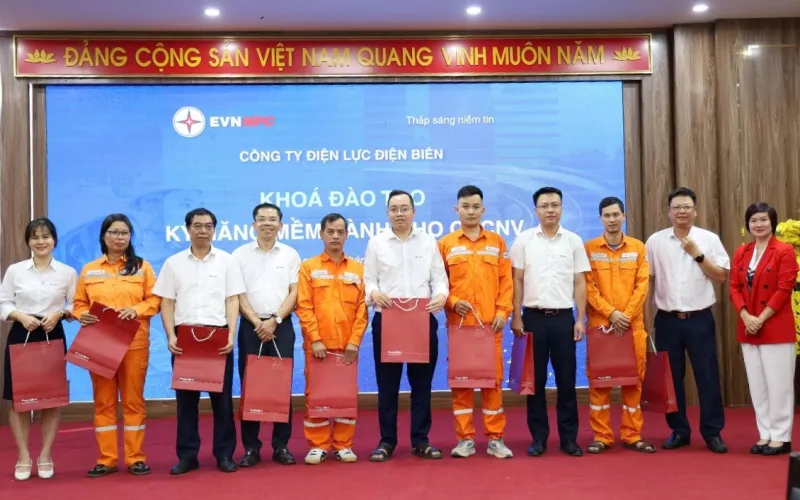 Chủ tịch HĐTV EVNNPC Đỗ Nguyệt Ánh trao tặng lính xung kích chiếc khăn chống nắng, thấm mồ hôi và cũng là đồ vật kỷ niệm 55 năm thành lập Tổng Công ty Điện lực miền Bắc. Ảnh: Ngọc Hà.